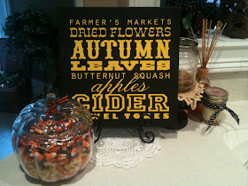 My fun Subway Art that I did in golden yellow vinyl on a piece of metal that I spray painted black. And, a pumpkin full of cany corn!